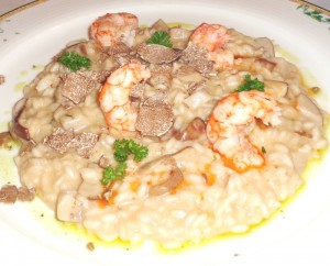 Ingredienti per 4persone : 25gamberi freschi, 800gr di porcini freschi, 1tartufo nero piccolo, 10cucchiai di riso, cipolla, aglio, prezzemolo, olio extravergine di oliva e sale q.b.