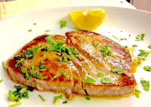 Anche alla pescheria Mare Blu di Corso Italia a Piano di Sorrento, il patron Aniello Castellano lo propone in tanti modi nella cucina annessa al locale. Alla Brace, Marinato, ad Involtini, alla Parmigiana con una variante con pomodorini gialli, o alla Pizzaiola, sono solo alcuni esempi dei piatti che qui si propongono con il gustoso pesce che insaporisce anche succulenti primi come i Paccheri con pesce spada e peperoni.