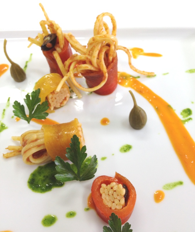 Nelle paelle, con il cous cous, in insalate crude o imbottito alla siciliana o alla napoletana rappresenta una delle pietanze più invitanti dei giorni di ferragosto. In Campania il peperone “mbuttunato” nasce vegetariano, la sua farcitura prevede solo melanzane, olive, capperi, acciughe mollica di pane raffermo e aromi. Con il tempo nelle case ha preso corpo anche una versione con la carne tritata e uova ed una variante che prevede addirittura la pasta (tipo bucatini o linguine), prendendo il nome di “peperone imbottito alla caprese”. Proprio questa variante ha ispirato lo chef Vincenzo Galano chef executive dell’ Hotel Hilton di Sorrento che propone una versione molto personale del peperone imbottito con la pasta. La sua ricetta che si chiama “Involtini di peperoni con linguine infornate” (sotto) rivisita la tradizione e rende il piatto più leggero e teatrale. Il peperone non rimane intero, ma tagliato a strisce larghe avvolge la pasta preparata con un sugo alla “puttanesca” e poi viene infornato.