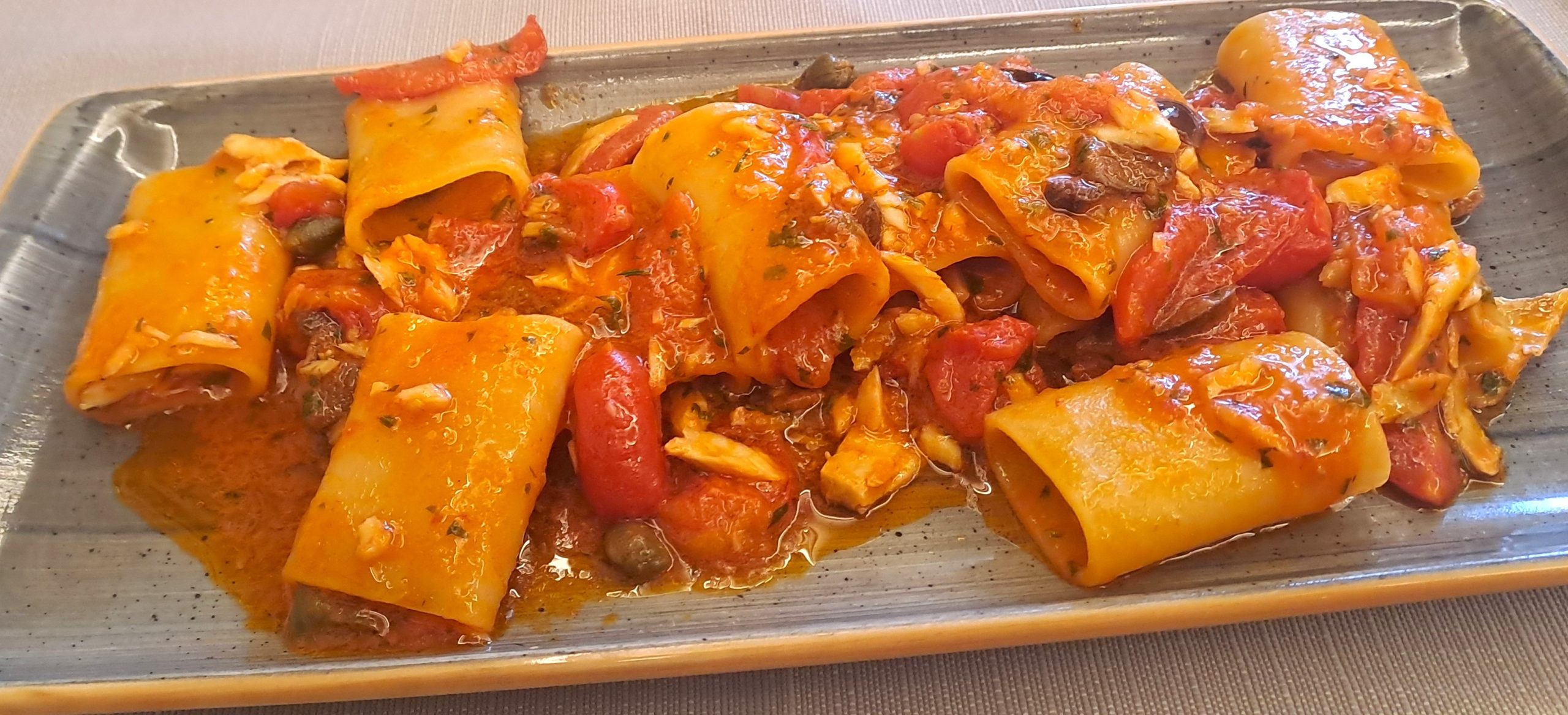 Paccheri con stoccafisso pomodorini, capperi e olive nere