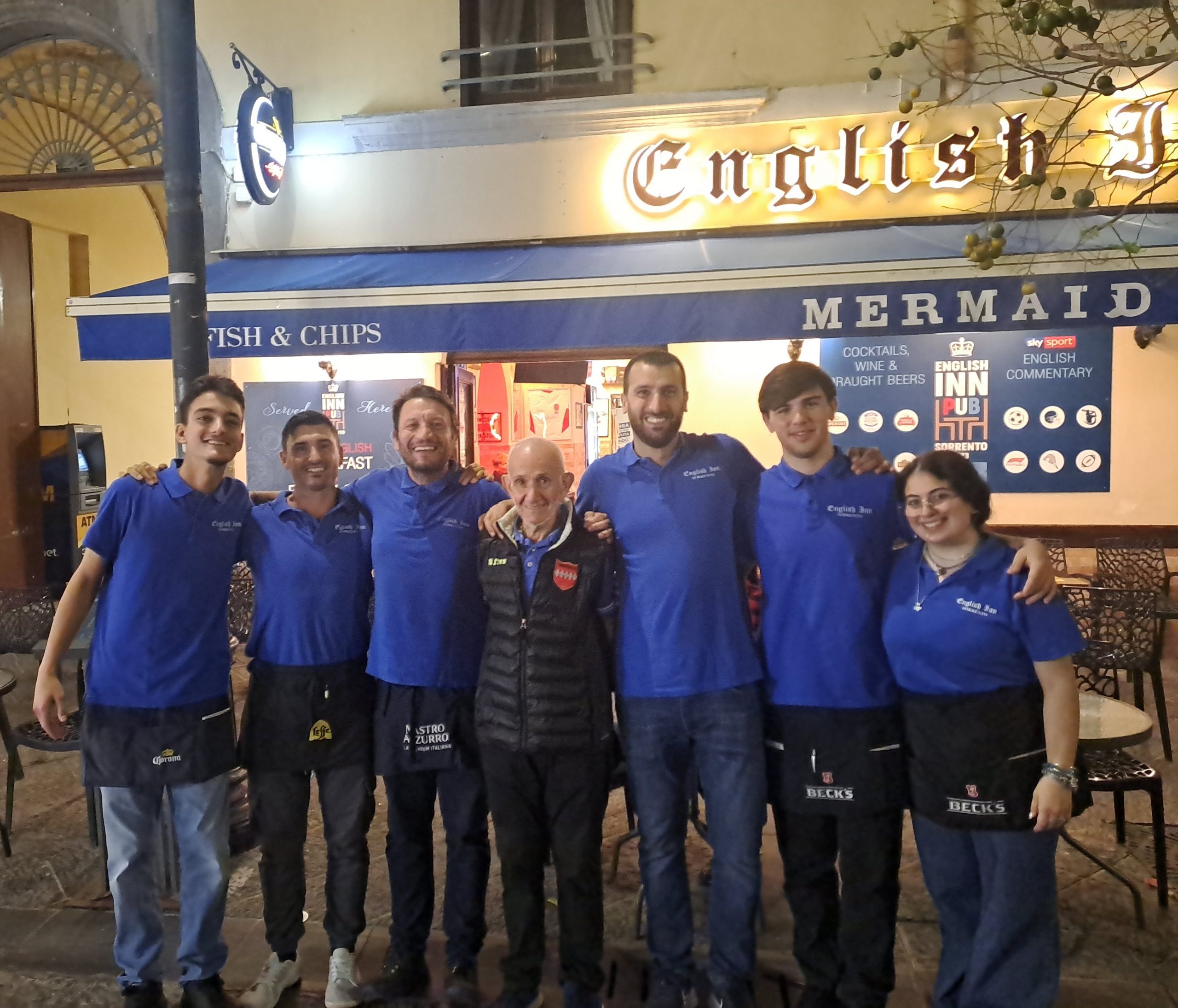 Foto apertura English Inn Nella foto con Franco Cappiello al centro, la brigata di sala composta da Alessio Caccioppoli, Simone Casa, Claudio Casa, Ilaria Fucito, Fabio Estasi e Danny Pacini.