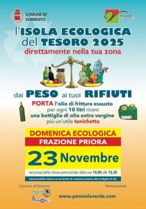 Torna l’Isola Ecologica del Tesoro, l’iniziativa del Comune di Sorrento e di Penisolaverde dedicata alla sensibilizzazione sulla raccolta differenziata. Dal 24 al 29 novembre, i cittadini che conferiranno rifiuti come piccoli elettrodomestici, riceveranno in cambio barattoli di marmellata. L’iniziativa è promossa nell’ambito della Settimana europea per la riduzione dei rifiuti e si avvale della collaborazione del Centro di Coordinamento RAEE – Rifiuti di apparecchiature elettriche ed elettroniche. Domenica 23 novembre, a Priora, protagonista sarà invece l’olio di frittura esausto che potrà essere conferito nei pressi della chiesa parrocchiale, dalle ore 10 alle 12.30. Per ogni 10 litri di rifiuto sarà consegnata una bottiglia di olio extra vergine di oliva oltre ad una tanichetta.