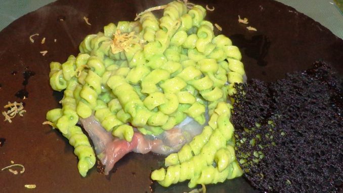 Assemblaggio: cuocere i fusilli in abbondante acqua salata, colare e spadellare nella crema di zucchine. Mettere nel piatto poggiandola sull’orata marinata