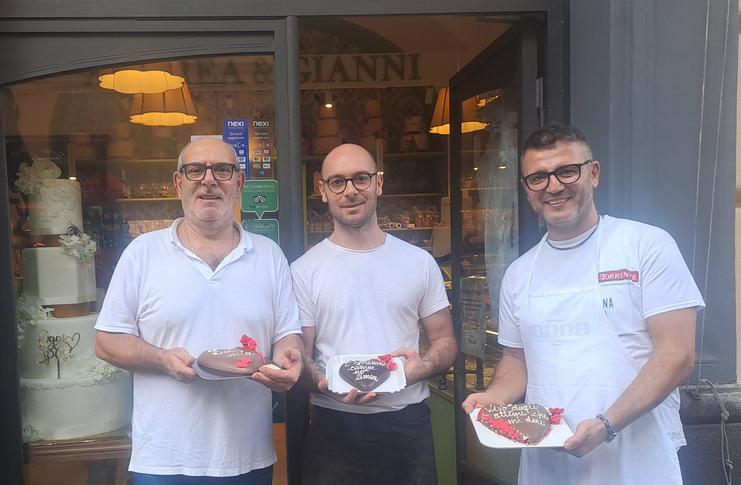 Foto Apertura Giannie Andrea Vico Nella foto I maestri pasticceri, Andrea Celentano, con il figlio Antonio e Giovanni Starace con i torroni a forma di cuore.