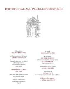 La prolusione, Cultura ed economia, intelligenza e libertà, sarà tenuta da Ignazio Visco, Governatore onorario della Banca d’Italia. Saranno 15 borsisti del primo anno e 11 del secondo a frequentare i corsi e i seminari offerti dall’Istituto fondato da Benedetto Croce, anche grazie al sostegno di: Università degli studi di Napoli «Federico II», Pio Monte della Misericordia, Fondazione Banco di Napoli, Fondazione Raffaele Mattioli per la storia del pensiero economico, Accademia dei Lincei, Premio Viki Morelli. Le attività scientifiche sono animate dal confronto con personalità del mondo accademico di rilievo nazionale e internazionale. L’Istituto conferma così il suo impegno di scuola di alta e libera formazione che, sin dalle origini, ha l’obiettivo di formare la futura classe dirigente: circa 1.400 allievi dalla sua fondazione, oggi docenti universitari di levatura internazionale ed esponenti di rilievo della vita intellettuale, politica e civile. I seminari tenuti dai borsisti costituiscono il centro dell’attività dell’Istituto; i corsi annuali destinati agli allievi saranno tenuti da Michele Ciliberto, Massimo Ferretti e Andrea Giardina; è previsto un ciclo di seminari su “Maestri e allievi dell’Istituto” e un ciclo di conferenze su “Napoli giacobina”; in programma, inoltre, “Conversazioni su lettere, arti, musica”, incontri e dibattiti aperti anche alla città. Negli ultimi anni i contributi pubblici – Dipartimento per le politiche di coesione e per il Sud, Ministero dell’Università e della Ricerca, Ministero della Cultura, Regione Campania – hanno consentito, oltre alla realizzazione dei densi programmi di alta formazione e ricerca e alla pubblicazione di sei collane editoriali e degli «Annali», l’incremento del patrimonio bibliografico, la digitalizzazione di fondi antichi e di documenti d’archivio e l’acquisizione di nuovi spazi per la sede.