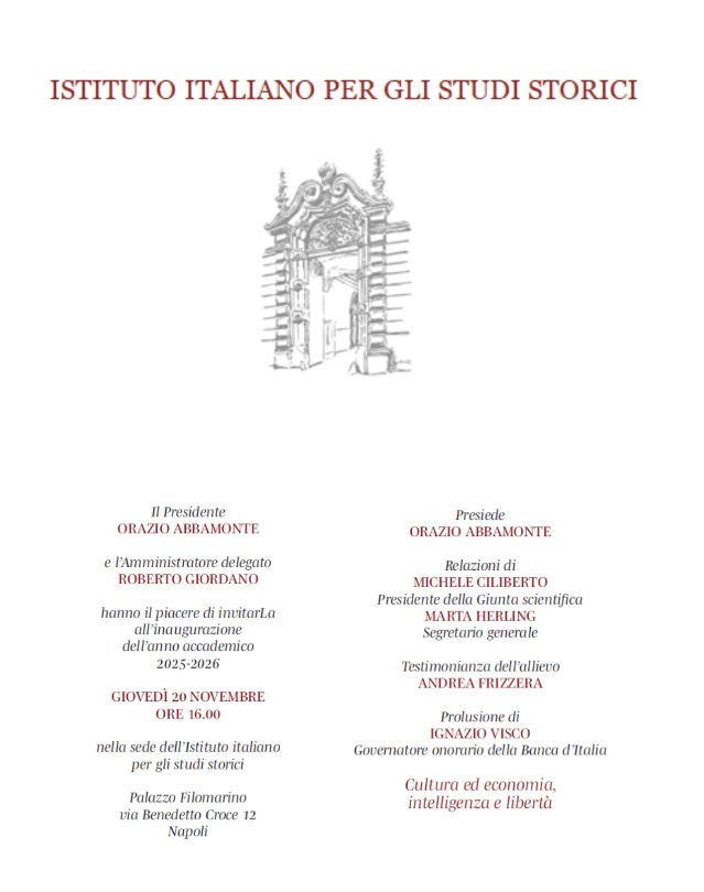 Giovedì 20 novembre alle 16 nella sede dell’Istituto italiano per gli studi storici (Palazzo Filomarino, via Benedetto Croce 12, Napoli) si inaugura l’anno accademico 2025-2026, il 78° dalla fondazione. La cerimonia sarà presieduta da Orazio Abbamonte, presidente dell’Istituto. Michele Ciliberto, presidente della Giunta scientifica, illustrerà il programma di corsi, seminari, conferenze e conversazioni del nuovo anno accademico; Marta Herling, segretario generale, presenterà i borsisti e le attività dell’Istituto e Andrea Frizzera darà la sua testimonianza di allievo.