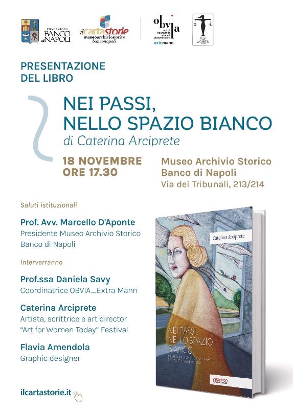 Una donna che riflette su Napoli, tra arte, storia e identità femminile. Martedì 18 novembre alle 17:30 a Palazzo Ricca, sede della Fondazione Banco Napoli e del Museo dell’Archivio Storico (Via de Tribunali, 213), è in programma la presentazione del Libro Nei passi, nello spazio bianco. Riflessioni di una donna a Napoli e in mille luoghi ancora, di Caterina Arciprete, artista e art director del Festival Internazionale “Art for Women Today”. «Complice della mia protagonista è la città – spiega Arciprete – Napoli che amplifica le sue emozioni in una stratificazione di passioni, nei siti storici che visita, in storie antiche in cui scivola e si confonde. In quella energia vibrante che apre spunti di riflessione universale sulla donna. Un percorso che prende la forma invisibile di una via sospesa tra forza e vulnerabilità femminile. Quella via che rappresenta il caso e al tempo stesso l’abilità di essere sé stessi senza perdere la direzione». L’incontro si inserisce nel festival multidisciplinare che ha come protagoniste artiste internazionali e del territorio, volto a narrare la donna in dialogo con luoghi di grande valore storico e simbolico della città. L’evento si apre con i saluti istituzionali di Marcello D’Aponte, Presidente del Museo Archivio Storico del Banco di Napoli. Intervengono, oltre all’autrice, Daniela Savy Coordinatrice OBVIA_Extra Mann e Flavia Amendola graphic designer. “Art for woman today” è un collettivo internazionale di artiste contemporanee, creato per generare ponti tra culture, linguaggi e storie. Nato da un’idea di Arciprete, con il sostegno della galleria svedese ArtSight, il Festival approda a Napoli dopo eventi a Stoccolma, Roma e Ginevra, all’interno del circuito Obvia_Extra Mann. Fino al 21 novembre il festival prende vita musei, chiese e spazi culturali di Napoli in un dialogo tra arte, storia e identità femminile. I siti accolgono mostre, presentazioni di progetti editoriali d’arte, performance, musica, danza e talk.
