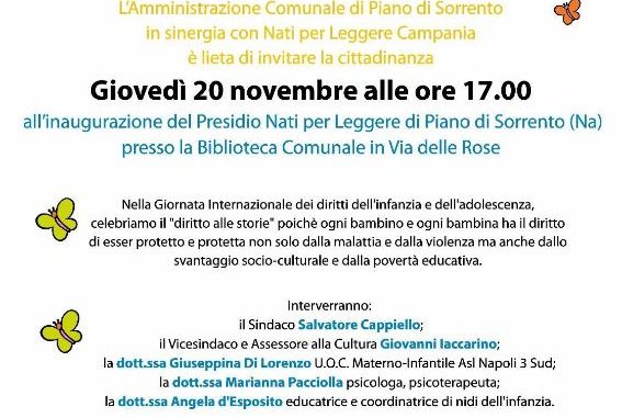 In occasione della Giornata Internazionale dei Diritti dell’Infanzia e dell’Adolescenza, l’Amministrazione Comunale di Piano di Sorrento, in sinergia con Nati per Leggere Campania, invita tutta la cittadinanza a partecipare all’inaugurazione del Presidio Nati per Leggere di Piano di Sorrento. L’evento si terrà giovedì 20 novembre alle ore 17.00 presso la Biblioteca Comunale (Via delle Rose).