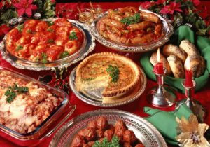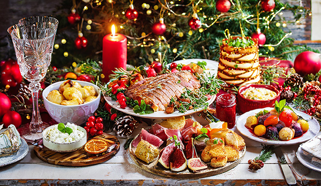 La tavola viene apparecchiata con particolare attenzione ai dettagli: si prediligono tovaglie ricamate nei toni del rosso o del bianco, candele, segnaposti tematici e centrotavola realizzati con rami d’abete o pigne. In questa occasione vengono utilizzati i migliori servizi di piatti e bicchieri. Le proposte culinarie variano da famiglia a famiglia, tuttavia lo schema classico comprende: