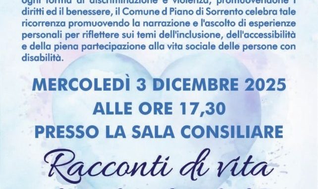 In occasione della Giornata Internazionale dei Diritti delle Persone con Disabilità, il Comune di Piano di Sorrento promuove “Racconti di vita oltre la disabilità”, un momento di incontro e riflessione aperto a tutta la cittadinanza. L’iniziativa si terrà domani, mercoledì 3 dicembre, alle ore 17:30 presso la Sala Consiliare del Comune di Piano di Sorrento.