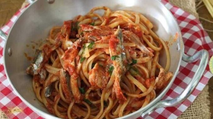 Ingredienti per 4 persone: 380 gr di linguine, 500 gr di alici fresche (spinate) una quindicina di pomodorini, prezzemolo tritato q.b. olio extravergine d’oliva q.b., 1 spicchio aglio