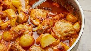 Ingredienti per 4 persone: Cosce di pollo 800 gr, Patate novelle 500 gr, 1 Cipolla, 1 Carota, 1 Costa di sedano, 100ml. di Vino bianco, 50ml. di Brodo, 2 foglie di Alloro, Timo q.b., Farnia, q.b., Olio extravergine di oliva q.b., Contentrato di pomodoro q.b., Sale q.b.