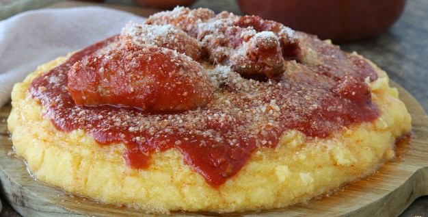 Intanto mettete a bollire l’acqua salata in una pentola capiente, appena bolle versate a pioggia la polenta mescolando. Continuate a mescolare fino a completo addensamento, regolatevi con i minuti di cottura riportati sulla confezione. Versate la polenta su una superficie di legno, allargatela con un cucchiaio e versate sopra il sugo e la carne. Aggiungete abbondante parmigiano o pecorino e gustatela in tutta la sua bontà.