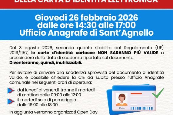 Il Comune di Sant’Agnello ha organizzato il primo Open Day dedicato al rilascio della carta d’identità elettronica. Dal 3 agosto 2026, secondo quanto stabilito dal Regolamento (UE) 2019/1157, le carte d’identità cartacee non saranno più valide, a prescindere dalla data di scadenza riportata sul documento. Diventeranno, quindi, inutilizzabili. Per consentire ai cittadini di effettuare la sostituzione entro la scadenza prevista, l’Ufficio Anagrafe del Comune di Sant’Agnello, in aggiunta ai propri orari di apertura al pubblico, sarà operativo in orari straordinari durante Open Day periodici dedicati. Il prossimo Open Day per il rilascio della CIE è giovedì 26 febbraio 2026 dalle 14:30 alle 17:00 (primo piano del Palazzo Municipale di Sant’Agnello, in Piazza Matteotti). Per il rilascio della carta di identità è necessario portare con sé la carta d’identità scaduta o in scadenza, una fotografia recente formato tessera, la tessera sanitaria e la ricevuta del pagamento pagoPA. Il pagamento può essere effettuato, tramite il Portale dei pagamenti, al seguente link: