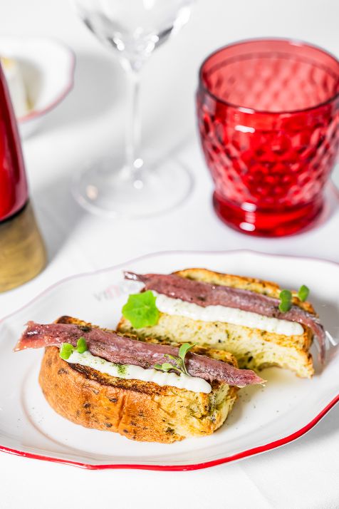 L’Incontro Antipasti da condividere: Panettone al burro ed alghe marine piastrato, servito con alici del Cantabrico. Battuto di scampi, asparagi e maionese al lime. Lingotti di polenta fritta con tarate di marchigiana e cremoso di Parmigiano Reggiano. Insalatina di carciofo e Parmigiano Reggiano Vacche Rosse.