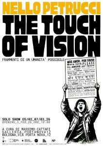 Una mano che sembra dischiudere una porta, da cui un volto seminascosto guarda l’osservatore. È l’opera che l’artista pompeiano Nello Petrucci ha svelato e completato dal vivo in occasione dell’inaugurazione di “The Touch of Vision”, la sua prima mostra personale a Bologna, presso la galleria Portanova12. Si tratta di un’esposizione catartica e sperimentale che nasce dall’urgenza di diffondere “il verbo dell’amore” in un periodo storico segnato da conflitti, divisioni, paura, perdita di senso e smarrimento.