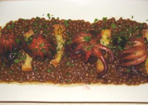 Un’operazione di recupero archeo-gastronomico che potrebbe avvicinare le nuove generazioni alle gustose zuppe e rinvigorire il ricordo dei più adulti. Un’idea semplicissima: sposare le zuppe contadine con il mare. Geniale ma elementare, spettacolare e ovvio al tempo stesso per una regione dove convivono due grandi tradizioni, quella contadina e quella marinara. Allora non resta che abbinare i frutti di una terra generosa ai figli di un mare unico ed il gioco è fatto. Un gioco di sapori che vede la rana pescatrice intrisa nella zuppa di ceci o il polpo di scoglio che si adagia sulle lenticchie o ancora l’uso di patate o scarole con il pesce. E vedere, poi, lo scampo che troneggia su una succulenta zuppa di fagioli diventa uno spettacolo per occhi e palato. Un’operazione riuscita, dunque, che la dice lunga sull’uso della fantasia negli abbinamenti in cucina e su quanto essi possono far crescere la gastronomia, anche con il recupero della memoria collettiva con piatti come il Polpo verace su scarole; Zuppa di fagioli e sconcigli; Polipetti su lenticchie, Pasta e patate con astice; Polpo e patate fritti; Minestra e baccalà; Pasta e fagioli con cozze.