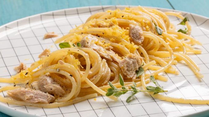 Ingredienti per 4 persone: 350 gr. di Spaghettoni di Gragnano; 150 gr. di filetti di tonno sott’olio; 1 grosso limone di Sorrento; origano fresco; olio extravergine di oliva, sale e pepe q,b.