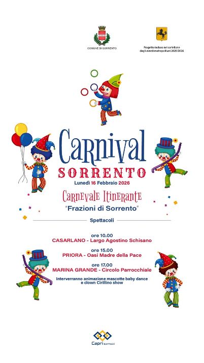 Si parte domenica con “Aspettando il Carnevale”. Dalle ore 10 alle 13 e dalle ore 15 alle 18, i bambini potranno divertirsi tra spettacoli con artisti circensi, clown, giocolieri, trampolieri, maghi, la baby dance con Ilaria Propoli e lo spettacolo di burattini con i Fratelli Mercurio.Lunedì 16 febbraio, il clown Cirillino, insieme a tante mascotte, spettacoli e baby dance animeranno il “Carnevale itinerante” tra le frazioni, che toccherà alle ore 10 Casarlano, alle ore 15 Priora e alle ore 17 Marina Grande.