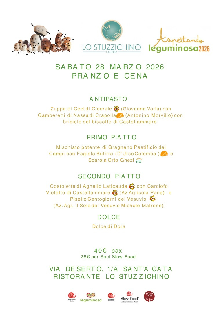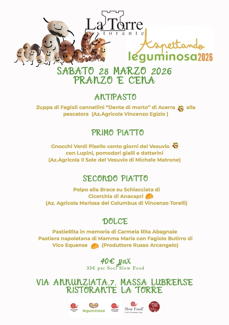 Tra questi appuntamenti, sabato 28 marzo, i ristoranti La Torre e Lo Stuzzichino, insieme al Mercato della Terra Costiera Sorrentina, danno vita a “Aspettando Leguminosa”: un’esperienza che attraverso i 2 menu dedicati, unisce cucina, cultura e territorio in un percorso di valorizzazione dei legumi, autentici protagonisti della dieta mediterranea e simbolo di sostenibilità. L’iniziativa si inserisce nel cammino che conduce all’evento principale, in programma l’11 e 12 aprile alla Stazione Marittima di Napoli, e rappresenta un’occasione concreta per riscoprire varietà locali, Presìdi Slow Food e tradizioni gastronomiche, attraverso menu dedicati e il racconto diretto dei produttori. Un momento di comunità e condivisione, in cui il cibo diventa linguaggio culturale e strumento di consapevolezza, capace di raccontare