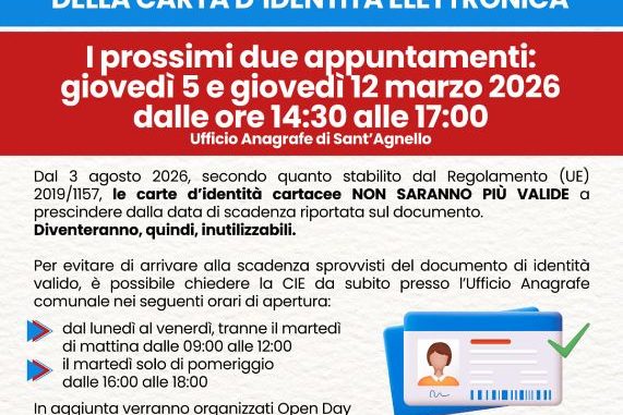 Al Comune di Sant’Agnello due nuovi Open Day dedicati al rilascio della carta d’identità elettronica: giovedì 5 marzo e giovedì 12 marzo 2026 dalle 14:30 alle 17:00 (Ufficio Anagrafe, primo piano del Palazzo Municipale di Sant’Agnello, in Piazza Matteotti). Dal 3 agosto 2026, secondo quanto stabilito dal Regolamento (UE) 2019/1157, le carte d’identità cartacee non saranno più valide, a prescindere dalla data di scadenza riportata sul documento. Diventeranno, quindi, inutilizzabili. Per consentire ai cittadini di effettuare la sostituzione entro la scadenza prevista, l’Ufficio Anagrafe del Comune di Sant’Agnello, in aggiunta ai propri orari di apertura al pubblico, sarà operativo in orari straordinari durante Open Day periodici dedicati comunicati di volta in volta tramite i canali istituzionali ufficiali. Per il rilascio della carta di identità è necessario portare con sé la carta d’identità scaduta o in scadenza, una fotografia recente formato tessera, la tessera sanitaria e la ricevuta del pagamento pagoPA. Il pagamento può essere effettuato, tramite il Portale dei pagamenti, al seguente link: https://www.cittadinodigitale.it/apspagopa/Payment/PagamentiAnonimiTipoPagamento/?ente=S_AGNELLO&codicePagamento=SA_CIE&tipoPag=all