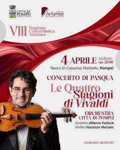 Con il concerto “Le quattro stagioni” di Vivaldi, in programma sabato 4 aprile 2026 alle ore 20 al teatro “Di Costanzo Mattiello” di Pompei (ingresso gratuito), entra nel vivo l’ottava Stagione Concertistica Artemus, giunta al suo terzo appuntamento. Per l’Orchestra Artemus, inoltre, si tratta un evento molto speciale. Il concerto rappresenta infatti l’esordio assoluto in qualità di “Orchestra Città di Pompei”: un riconoscimento istituzionale da parte del Comune, giunto lo scorso 26 marzo, che suggella un percorso artistico consolidato negli anni e che affida all’Orchestra il ruolo di ambasciatrice culturale del territorio.