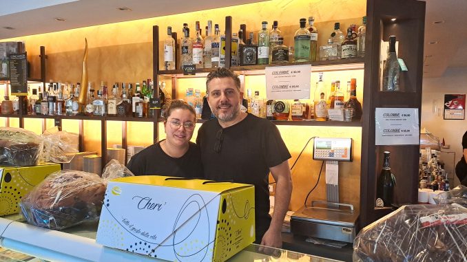 Le tante bontà artigianali sfornate ogni giorno dal bar pasticceria Cherì, tra cui graffe, croissant, piccola pasticceria, torte e babà, in questo periodo fanno rima con le specialità tipiche delle festività Pasquali, come le Colombe. Colombe artigianali che qui in via Ciampa, ai confini tra Sant’Agnello e Piano di Sorrento, prendono i sapori del cioccolato o delle scorzette d’arancio della costiera sorrentina che profumano di giardino. Morbide e fragranti vengono proposte dalla bravura dei pasticceri, del rinomato locale della famiglia Durante, in tante gustose versioni, tra cui quelle con la glassa classica di mardorle e granella di zucchero o con quella al cioccolato. Ma, ovviamente, in questo periodo nelle vetrine dello Cherì fa bella mostra anche il dolce simbolo della Pasqua partenopea: la Pastiera. Crosta di pastafrolla croccante e cuore morbido di ricotta e grano e frutta candita. Umida e gustosa con i chicchi di grano interi riesce a mantenere un equilibro perfetto tra tutti i suoi ingredienti. Nella foto Giovanni Durante e la giovane pasticcera Michela Aiello.