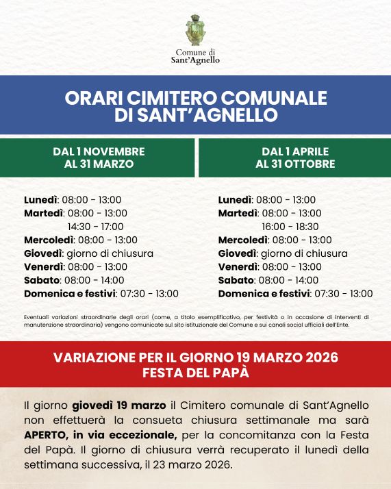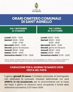In occasione della Festa del Papà, ricorrenza in cui è consuetudine per i cittadini dedicare un pensiero anche ai propri cari che non ci sono più, giovedì 19 marzo il Cimitero comunale di Sant’Agnello non osserverà la chiusura settimanale, ma sarà aperto in via eccezionale. A seguito di questa variazione, il turno di chiusura verrà recuperato lunedì 23 marzo 2026. Con Delibera di Giunta n.7 del 16.01.2026 gli orari invernali ed estivi del Cimitero comunale di Sant’Agnello sono stati così definiti: