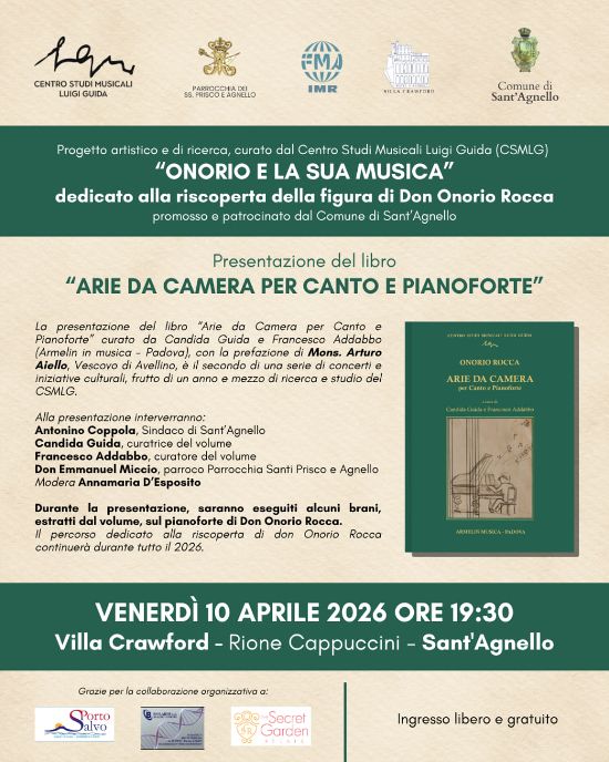 Venerdì 10 aprile 2026 alle ore 19:30 a Villa Crawford, nel luogo che ha ospitato la creatività e l’opera di divulgazione di Don Onorio Rocca, verrà presentato il libro “Arie da camera per Canto e Pianoforte” curato da Candida Guida, Presidente del CSMLG, e da Francesco Addabbo, con la prefazione di Mons. Arturo Aiello, Vescovo di Avellino, profondamente legato alla figura di Don Onorio. Alla presentazione sono previsti gli interventi del Sindaco di Sant’Agnello Antonino Coppola, di Mons. Arturo Aiello, del parroco della Parrocchia dei Santi Prisco e Agnello Don Emmanuel Miccio e dei curatori del volume, moderati da Annamaria D’Esposito. «In questo libro si è scelto di pubblicare la musica vocale da camera a noi pervenuta, lasciando a un successivo lavoro l’edizione della musica sacra e di quella esclusivamente pianistica – spiegano i curatori Candida Guida e Francesco Addabbo – Le composizioni ritrovate disegnano la figura di un musicista autentico, figlio del suo tempo, nel cui stile convivono echi pucciniani, suggestioni della moderna musica americana e influssi del pianismo napoletano più raffinato. Così, tra testimonianze frammentate e note che tornano a vibrare dopo decenni di silenzio, la figura di Don Onorio Rocca riemerge oggi con tutta la sua grazia: sacerdote, poeta, filosofo e musicista dell’anima, capace di trasformare ogni suono in un atto d’amore». Durante la presentazione saranno eseguiti alcuni brani, estratti dal volume, sul pianoforte originale di Don Onorio Rocca. Ingresso libero e gratuito.