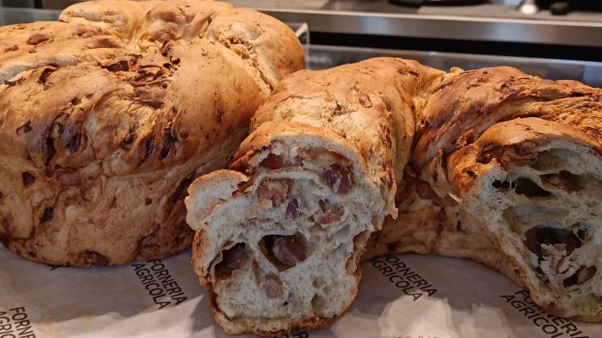 Mentre il Tortano è tipico della città di Napoli. Ma nel variegato mondo di queste torte salate c’è anche quello proposto dalla Forneria Agricola Caccioppoli di Sant’Antonio Abate. Un Casatiello molto particolare che i fratelli Gianluigi e Salvatore impastano con la mortadella (Bologna Dop) ed il provolone del Monaco, oltre a qualche altro salume, sugna e pepe. Ovviamente anche l’impasto è di gran qualità come tutti i pani che sono preparati con vari grani tra cui quelli coltivati in proprio con il controllo diretto su tutta la filiera. Ma a pochi giorni dalla Pasqua, in questo tempio dell’arte bianca e dell’impasto, non poteva mancare la Colomba artigianale che vie proposta in ben quattro versioni: classica, con albicocche pellecchielle del Vesuvio, con arancia e cioccolato e con caffè, limone e menta. Nella foto Gianluigi Caccioppoli con la madre Angela.