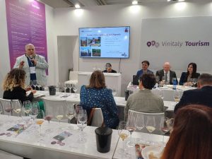A dimostrazione che il vino sannita è un ambasciatore di storia e innovazione, a conferma che il brand Sannio è oggi sinonimo di affidabilità e carattere unico. A fare da traino sono stati tre pilastri strategici: il viaggio nel solco del vaso di Assteas, un omaggio “liquido” al cratere che rappresenta il “Ratto di Europa” custodito a Montesarchio (Bn) nel Museo archeologico nazionale del Sannio Caudino e definito “il vaso più bello del mondo”. Quest’opera millenaria, che costituisce un unicum nel campo dell’arte e dell’archeologia, ha guidato i visitatori alla scoperta delle IG sannite, diventando protagonista anche nell’arte della mixology, capace di nobilitare i vini locali in una veste inedita in grado di intercettare le nuove tendenze del gusto. Angelo Zotti ha proposto un cocktail dedicato ad Assteas (a base di vino Aglianico del Taburno Docg) e Giallo Janara (a base di vino Falanghina del Sannio Doc), con l’aggiunta di altri prodotti sanniti come il vermouth, il gin, il bitter e il liquore Strega, capaci di disegnare un filo narrativo che lega la tradizione alla modernità; l’EnoArte: una performance artistica di Elisabetta Rogai che per le sue opere ha utilizzato il vino rosso al posto del colore, evidenziando il legame indissolubile tra cultura e agricoltura. L’evento ha visto anche la degustazione di due liquori sanniti, Amaral, a base di Aglianico Docg ed Euforja, a base di Falanghina Doc, entrambi prodotti da ‘Meraviglie Sannite’, di cui è anima Sandra Mastella e la presentazione “Discovery Sannio” nell’ambito dello spazio “Vinitaly Tourism”, uno dei progetti più rilevanti di Vinitaly 2026, che ha proposto convegni, degustazioni esperienziali e momenti di networking, diventando un osservatorio avanzato sull’evoluzione dell’accoglienza in cantina, del direct-to-consumer e dell’integrazione tra vino e turismo. All’attenzione della platea (quello sannita è stato l’unico consorzio di tutela vini a partecipare) è stato presentato un viaggio esperienziale che ha permesso di “immergersi” in maniera virtuale e sensoriale nel paesaggio beneventano, promuovendo il Sannio come destinazione enoturistica d’eccellenza.